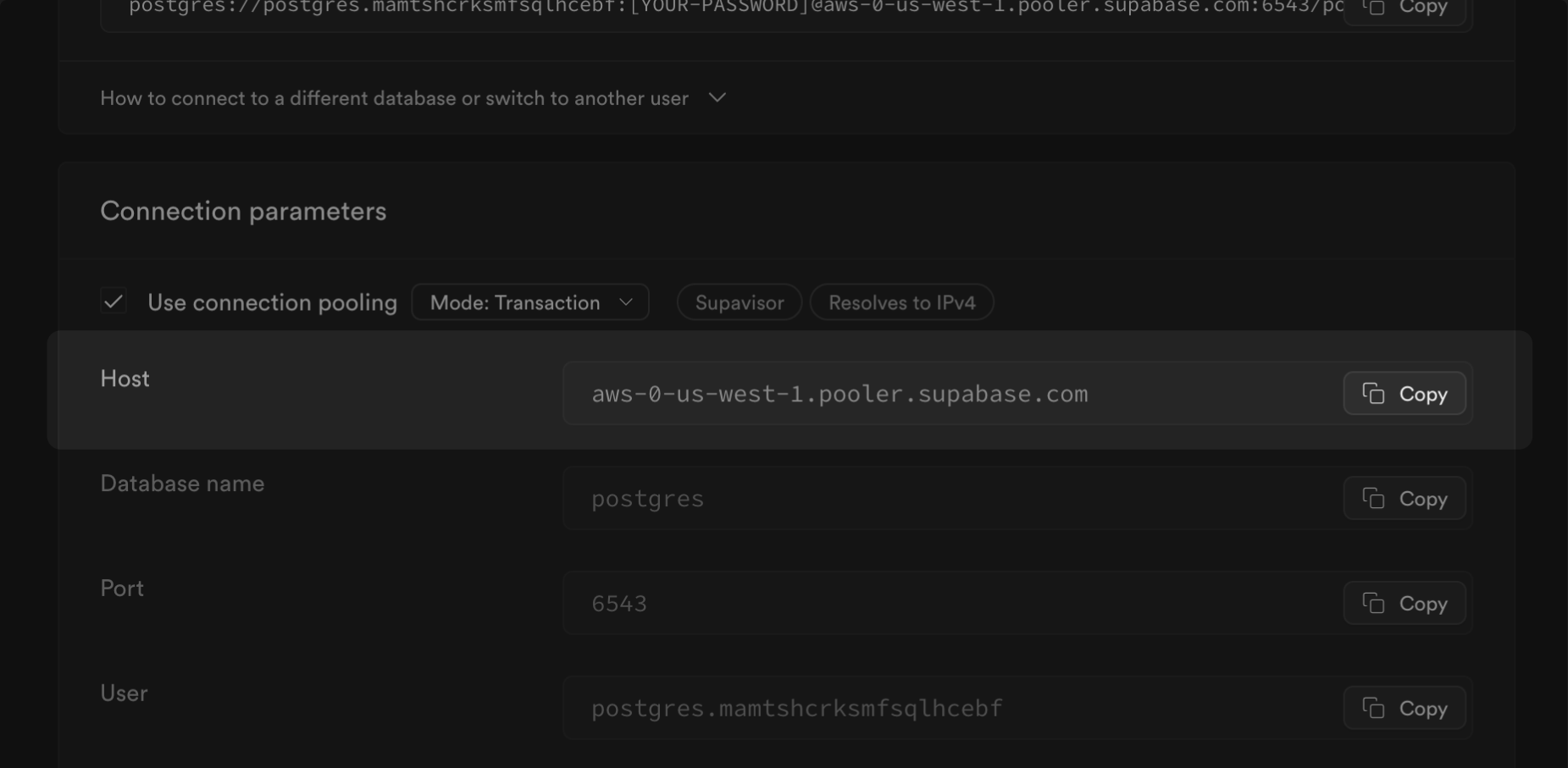 3. Under the Session pooler, click on the View parameters under the connect string. Note your Host ($SUPABASE_HOST).