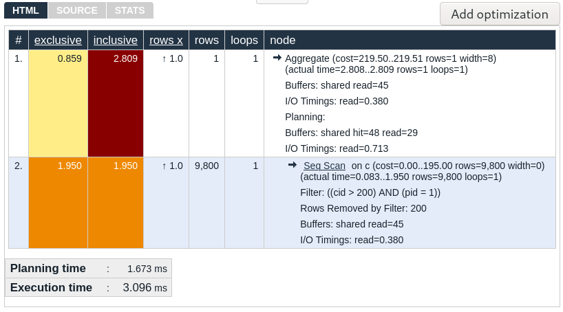 Since reading a longer execution plan is quite cumbersome, you can use the website https://explain.depesz.com/ to better visualize the query. If you paste the execution plan in the text area and hit “Submit”, you will get output like this: